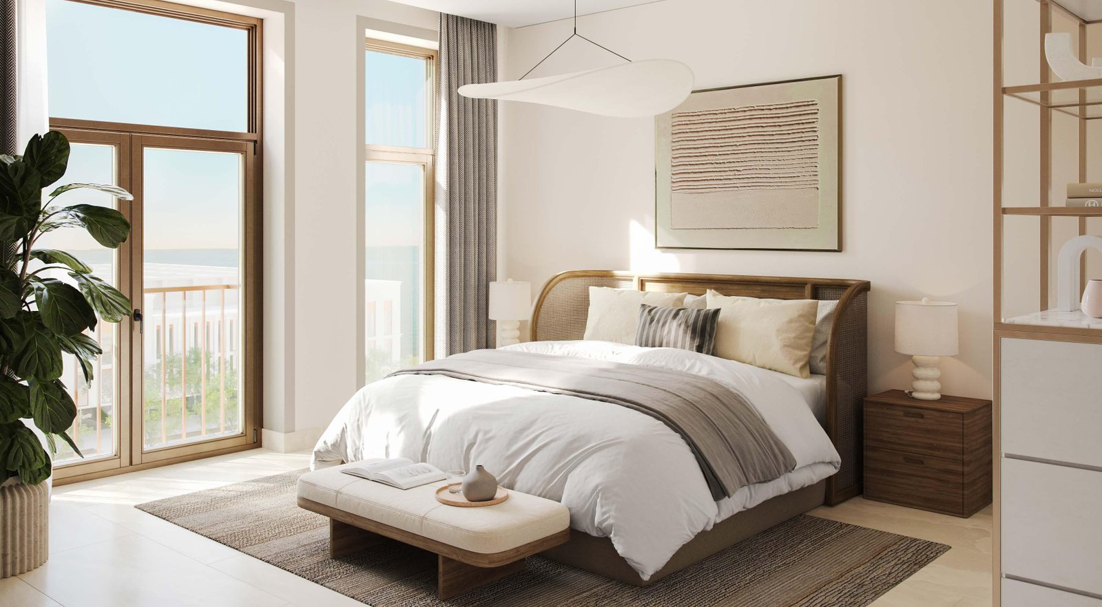 Nawayef Park Views by Modon Properties is Modon’s first apartment release on Hudayriyat Island, delivering a rare and sophisticated blend of authentic Portuguese-Mediterranean charm and contemporary luxury in a serene island setting. Nestled harmoniously between two distinctive Nawayef hills, this off-plan development features elegant low-rise buildings (ground + five floors) with curved lines, whitewashed facades, natural materials, and sunlit terraces that embody timeless Mediterranean elegance.