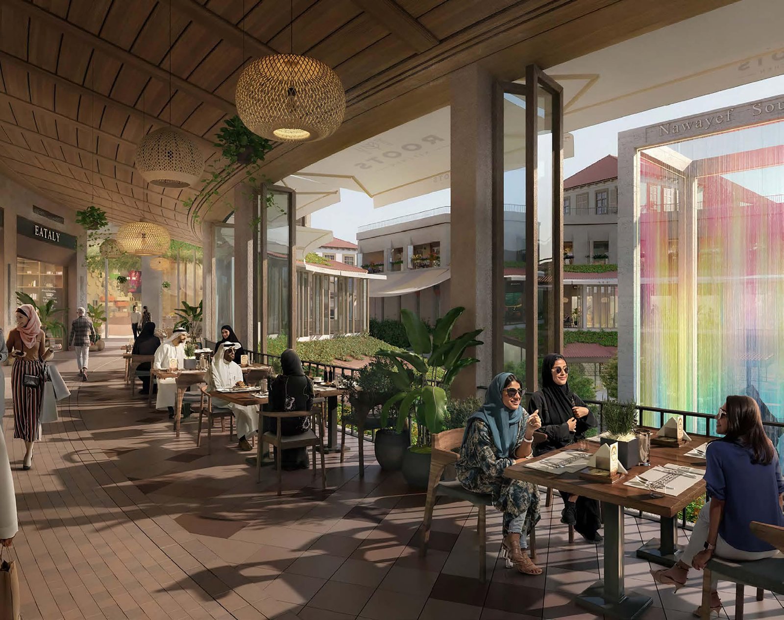 Residents enjoy a curated wellness-focused lifestyle with fully equipped gym, yoga studio, lap pool, children’s splash pool, outdoor sports courts, jogging paths, landscaped gardens, clubhouse, co-working space, concierge, retail shops, cafes, and direct access to beach and Nawayef Souq.