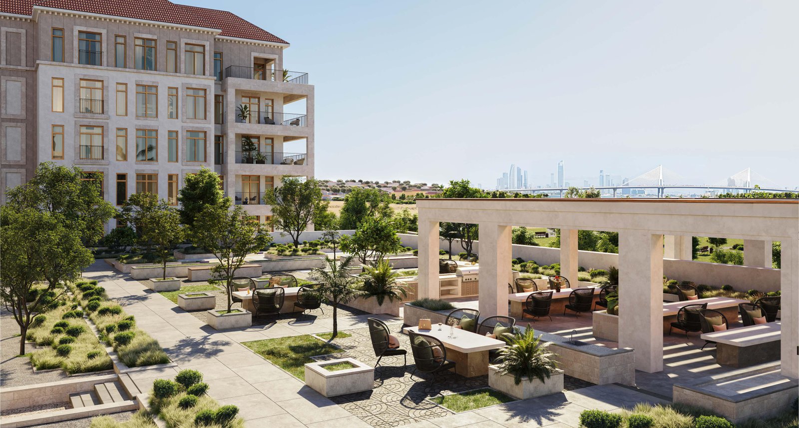 Nawayef Park Views by Modon Properties is Modon’s first apartment release on Hudayriyat Island, delivering a rare and sophisticated blend of authentic Portuguese-Mediterranean charm and contemporary luxury in a serene island setting. Nestled harmoniously between two distinctive Nawayef hills, this off-plan development features elegant low-rise buildings (ground + five floors) with curved lines, whitewashed facades, natural materials, and sunlit terraces that embody timeless Mediterranean elegance.